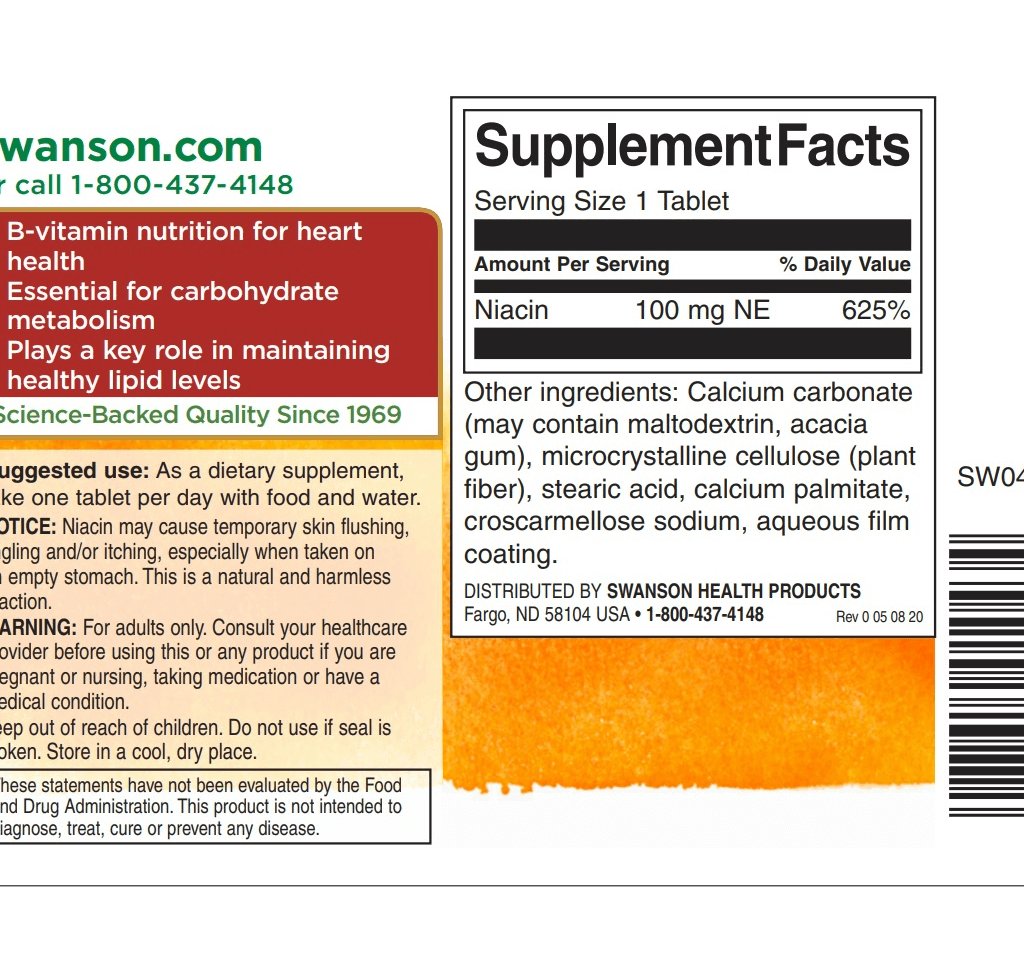 سوانسون نیاسین یک ویتامین ضروری برای حمایت از عملکرد قلب و عروق با ارتقا سطح چربی سالم است. همچنین متابولیسم کربوهیدرات را تقویت می کند و به تامین انرژی کل بدن کمک می کند. این کپسولهای پرقدرت 100 میلیگرم نیاسین را بهعنوان یک راه راحت برای دریافت منبع سالم نیاسین در روز ارائه میکنند.