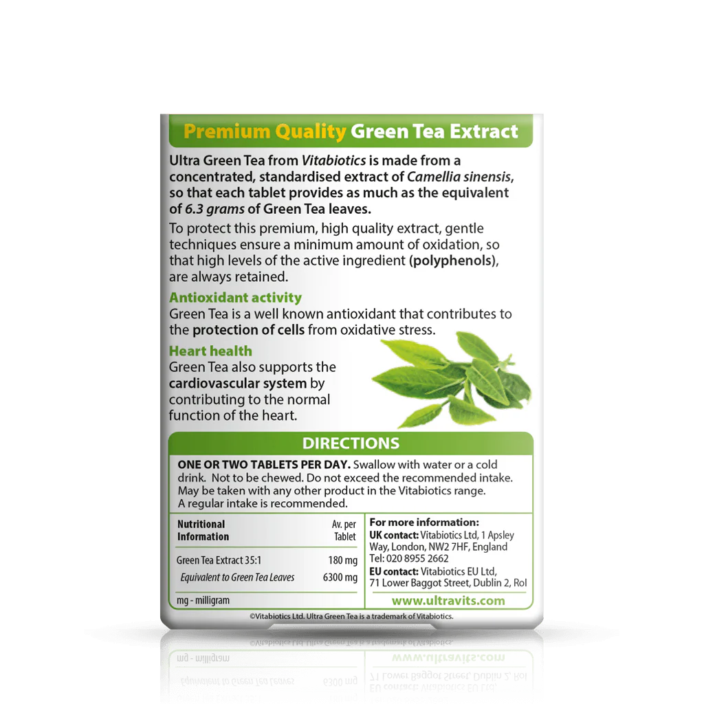 چای سبز اولترا ویتابیوتیکس حاوی ۱۸۰ میلیگرم عصاره چای سبز است. چای سبز اولترا از عصاره غلیظ و استاندارد شده گیاه کاملیا سیننسیس تهیه شده است، به طوری که هر قرص معادل ۶.۳ گرم برگ چای سبز را فراهم میکند. برای محافظت از این عصاره با کیفیت عالی، تکنیکهای ملایم، حداقل میزان اکسیداسیون را تضمین میکنند، به طوری که سطوح بالای ماده مؤثر (پلی فنولها) همیشه حفظ میشوند. چای سبز اولترا به طور خاص با سطح کاتچین کم و متوسط (EGCG کمتر از ۱۰۰ میلیگرم در هر قرص) فرموله شده است، بنابراین ایمن و مؤثر است.