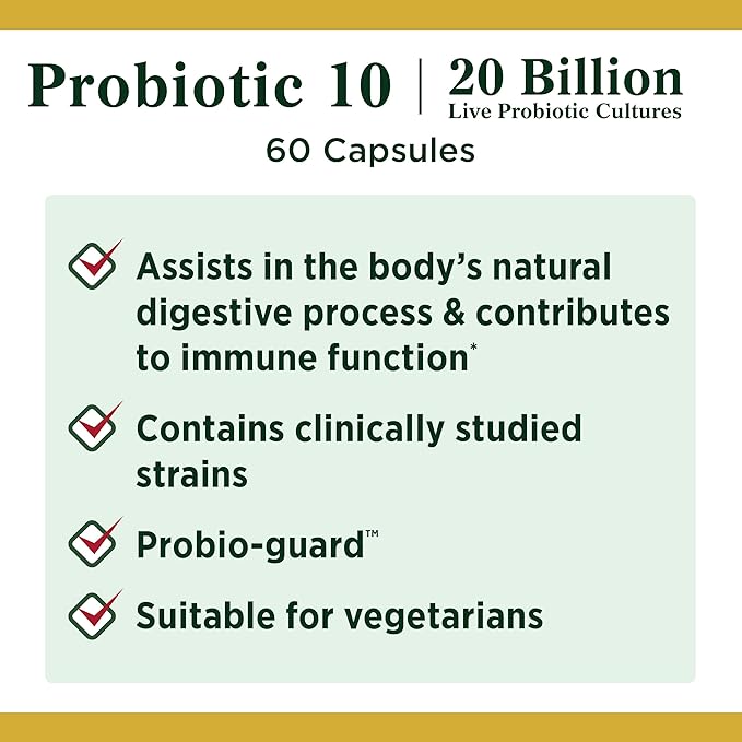 پروبیوتیک 10 نیچرز بونتی فرمولی جامع برای کسانی که به دنبال پروبیوتیک برای سلامت روده و سیستم ایمنی هستند، ارائه میدهد.(1) این مکمل با ترکیبی قوی از 10 سویه منحصر به فرد، برای پشتیبانی از سلامت گوارش و تقویت سیستم ایمنی بزرگسالان ساخته شده است.(1) هر کپسول پروبیوتیک 20 میلیارد CFU زنده را ارائه میدهد که پشتیبانی پیشرفتهای را برای سیستم گوارش شما فراهم میکند و به سلامت کل بدن کمک میکند.(1) فرمولاسیون منحصر به فرد ما نتیجه بیش از 20 سال تحقیق است که کیفیت و اثربخشی را ارائه میدهد. پروبیوتیک 10 نیچرز بونتی یک فرمول روزانه است که گنجاندن آن در برنامه روزانه شما را آسان میکند. برای یک گزینه پروبیوتیک با پشتوانه علمی و با کیفیت بالا که به طور یکپارچه در سبک زندگی شما ادغام میشود، به نیچرز بونتی اعتماد کنید.